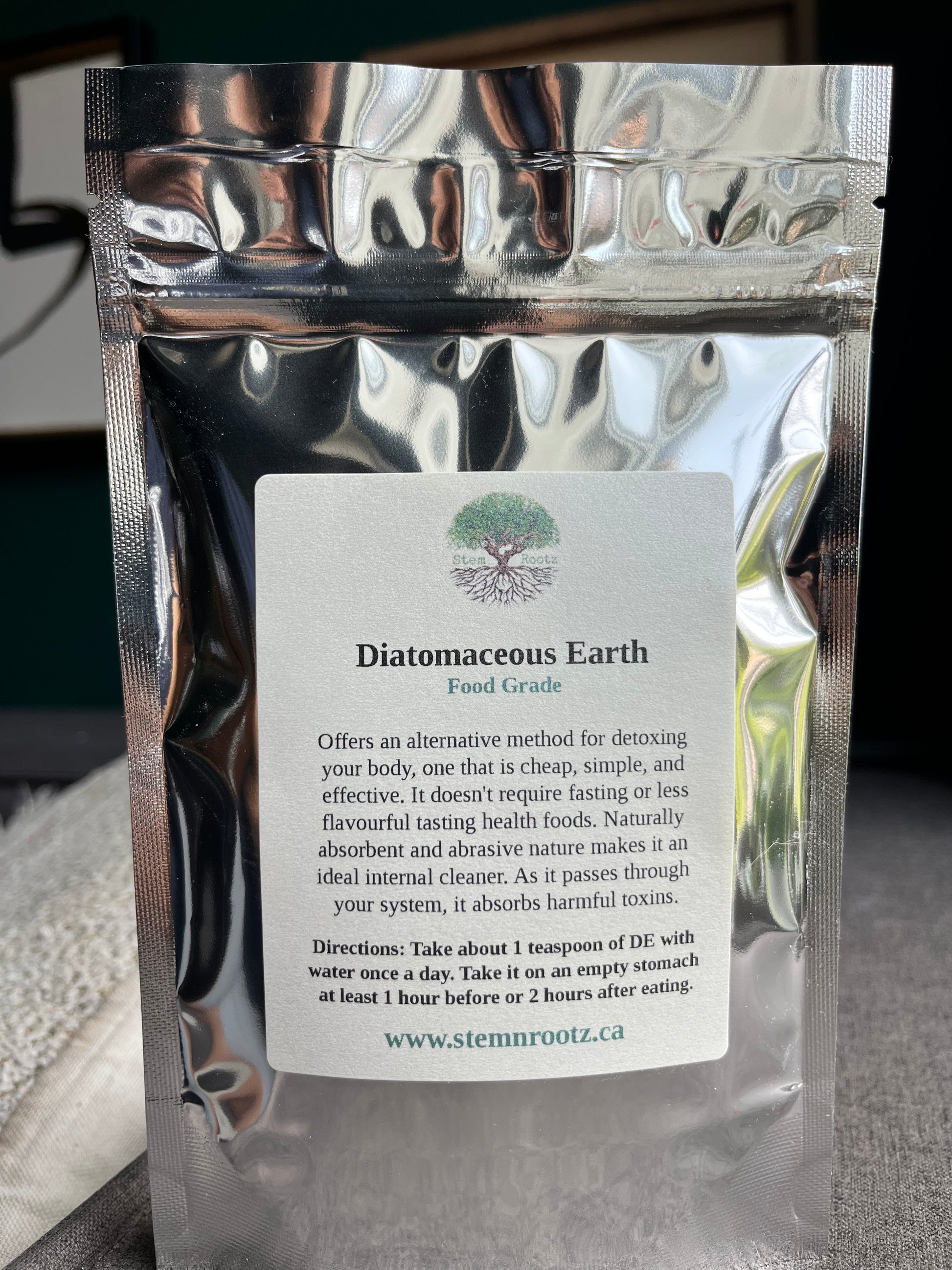 Diatomaceous Earth is a natural mineral-rich substance known for its ability to support detoxification, digestive health, and pest control. Composed of fossilized algae called diatoms, it is valued for its silica content, which promotes healthy hair, skin, nails, and bones. It also helps cleanse the digestive tract, remove toxins, and support gut health.