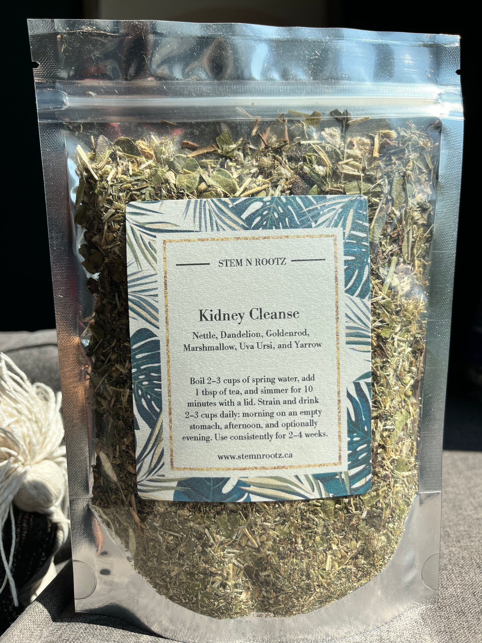 Kidney Cleanse is a powerful herbal blend traditionally used to support kidney function, promote detoxification, and maintain urinary tract health. Made with nettle, dandelion, goldenrod, marshmallow, uva ursi, and yarrow, this cleansing formula stimulates the kidneys to filter uric acid and toxins more efficiently from the bloodstream. It acts as a natural diuretic, encouraging healthy urine flow and reducing fluid retention, while soothing and protecting delicate urinary tissues.