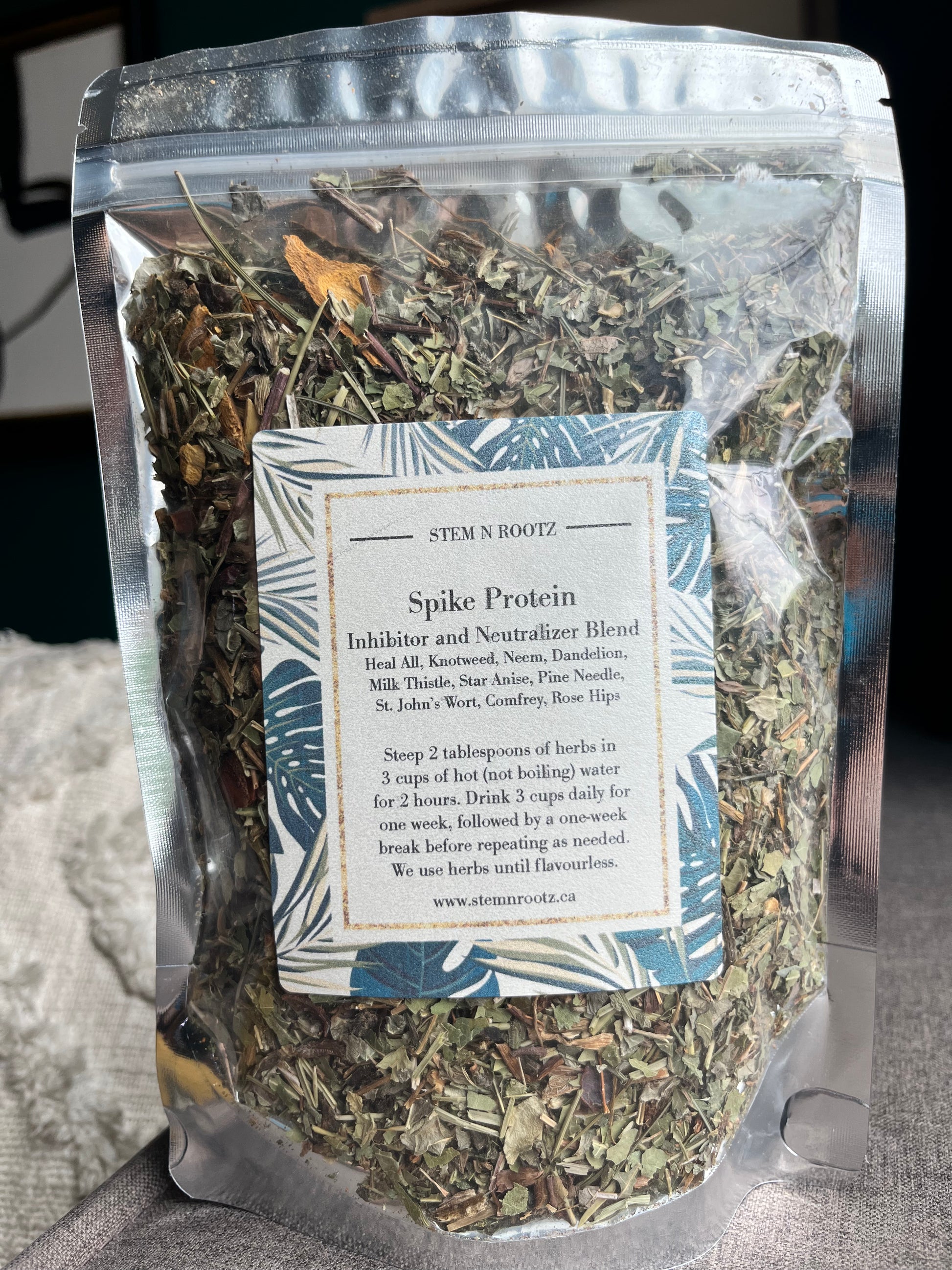Spike Protein Detox Blend is a powerful herbal formula designed to help cleanse the body of lingering spike proteins post-injection or infection. Featuring a synergistic combination of Heal-All, emodin (from knotweed), neem, dandelion leaf, milk thistle (glutathione booster), star anise, pine needles, St. John’s Wort, comfrey leaf, and vitamin C (from rose hips), this blend supports detoxification, immune health, and cellular repair. It works to protect vital tissues, promote tissue healing, and strengthen the body's resilience.